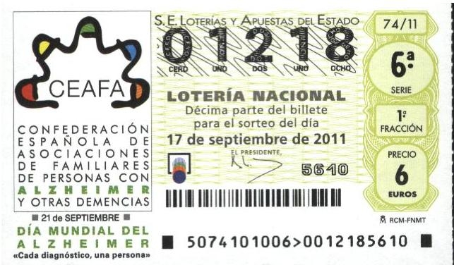 Contribueix a commemorar el Dia Mundial de l'Alzhèimer el 21 de setembre de 2011, promocionant-lo i sensibilitzant-hi la població, mitjançant la difusió de la imatge corporativa de CEAFA i del lema d'enguany -“Cada diagnòstic, una persona”- a tots els dècims dels sorteig de la loteria nacional de la jornada 74/11, que coincideix amb DISSABTE, 17 DE SETEMBRE DE 2011.